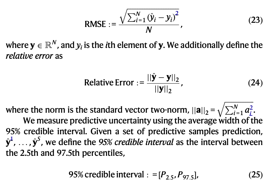 误差与不确定性指标 我们使用均方根误差(RMSE)或相对误差来衡量预测误差。给定一个预测值ŷ和一个参考值(真实值)y,RMSE定义如下: