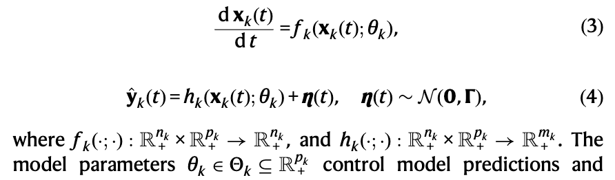 本研究中采用的贝叶斯多模型推理流程如图1所示:首先,我们通过贝叶斯推理估计未知模型参数,将现有模型校准至训练数据;然后,我们利用多模型推理方法将各模型得到的预测概率密度进行组合;最后,提供系统生物学研究中重要变量的改进型多模型预测。贝叶斯多模型推理通过取每个模型预测密度的线性组合来构建预测器。