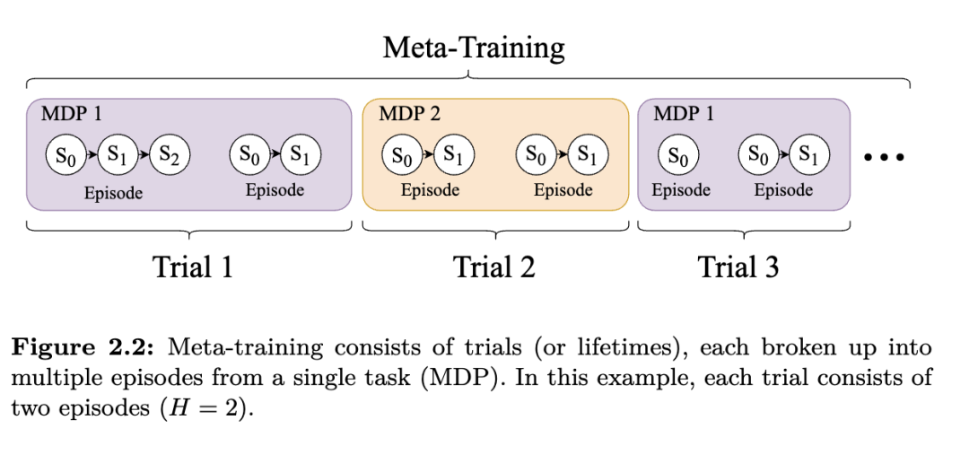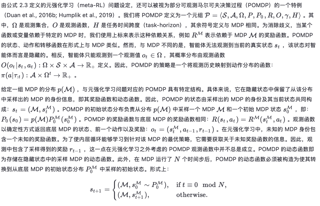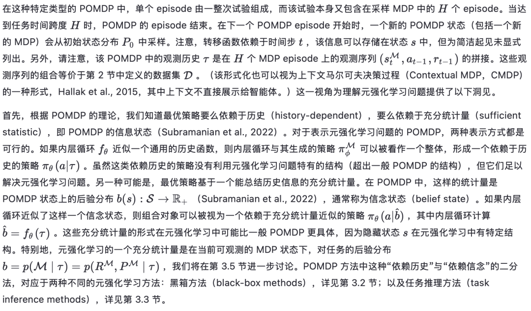 最后,尽管元强化学习通常考虑的是 MDP 上的分布,但也可以考虑 POMDP 上的分布。在这种情况下,每个任务本身也是部分可观测的。这构成了另一种类型的 POMDP,称为元-POMDP(meta-POMDP)(Akuzawa et al., 2021)。元-POMDP 可以写成一个 POMDP,其中隐藏状态的一部分在整个试验过程中保持不变,且可以对现有方法进行调整以适应这种结构(Akuzawa et al., 2021)。