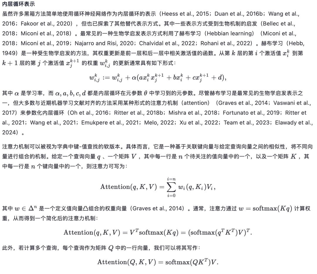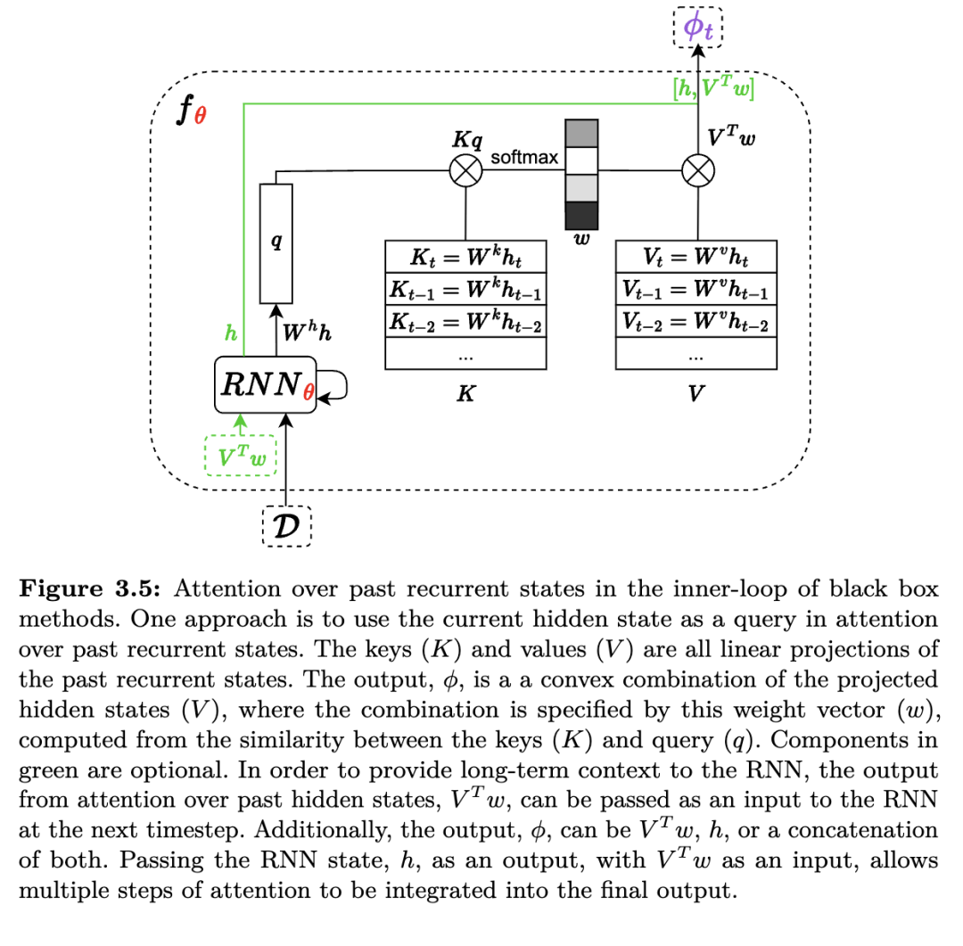 一些方法将注意力机制与卷积相结合(Mishra et al., 2018),或在过去的循环状态上使用注意力(Ritter et al., 2018b;Fortunato et al., 2019;Team et al., 2023;Oh et al., 2016),而另一些方法则仅使用自注意力(self-attention)(Ritter et al., 2021;Wang et al., 2021;Team et al., 2023)。例如,为了关注过去的循环状态,查询向量 q可能是当前循环网络隐藏状态的函数,而键矩阵 K和值矩阵 V可能是(两个不同的线性投影)所有先前隐藏状态的计算结果,这些隐藏状态是基于数据集 D得到的。这类方法的一般化形式如图 3.5 所示。相比之下,自注意力模型首先将 Q、K和 V均表示为输入 D的线性投影,然后在多个连续的注意力层中,将其表示为前一层注意力输出的线性投影。
