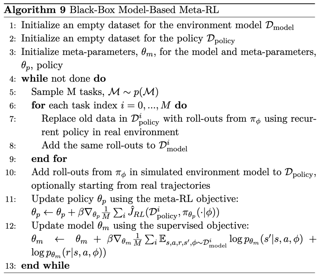 例如,一种简单的方法是学习一个黑箱环境模型(不使用独立规划器),运行标准强化学习算法,但在策略梯度估计中使用模型生成的额外数据。模型本身通过在策略收集的相同轨迹上对转移函数和奖励函数进行最大似然估计进行训练。此类模型的伪代码见算法9。在此基础上,可直接将策略条件化于为转移或奖励模型适配的参数上,这也可被视为一种任务推断方法。