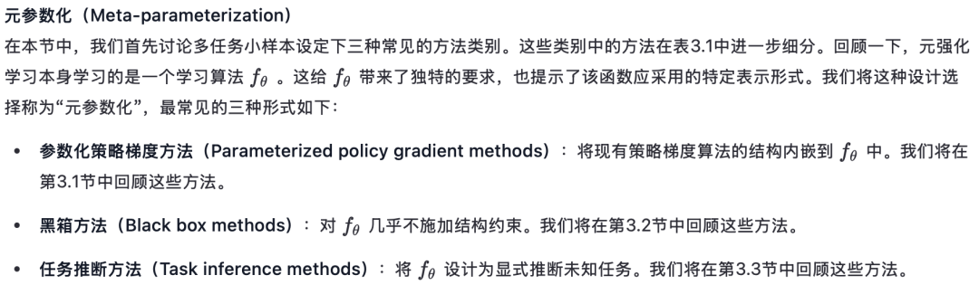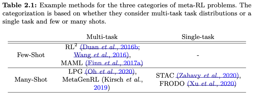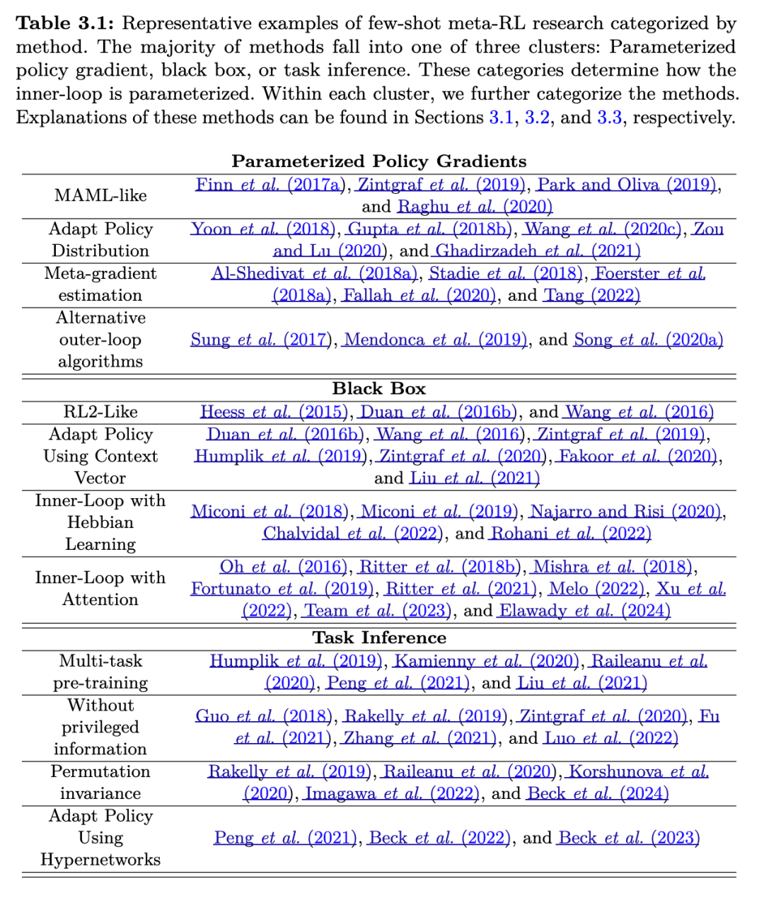 尽管上述每一类代表了一个离散的研究聚类,但其他作者可能采用不同的分类方式,或使用不同的名称指代这些聚类。例如,参数化策略梯度方法有时被称为“基于梯度的方法”(gradient-based methods,Finn 等, 2017a;Rakelly 等, 2019),或被归入元监督学习中更大的“基于优化的方法”(optimization-based methods,Hospedales 等, 2020)类别。此外,黑箱方法和任务推断方法有时被统称为“基于上下文的方法”(context-based methods,Rakelly 等, 2019)。