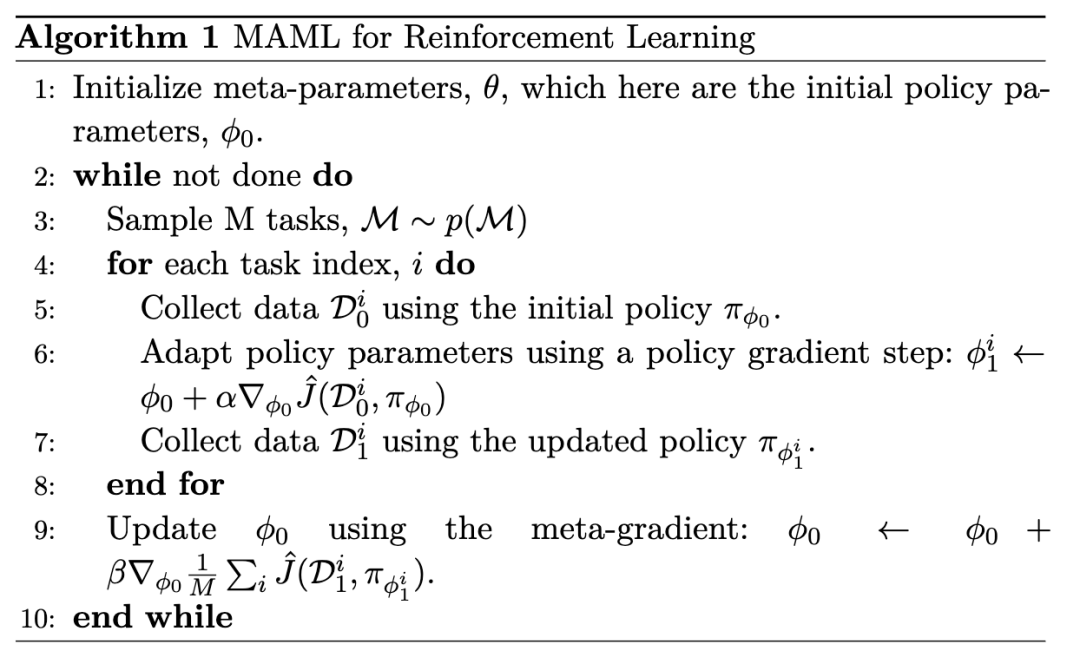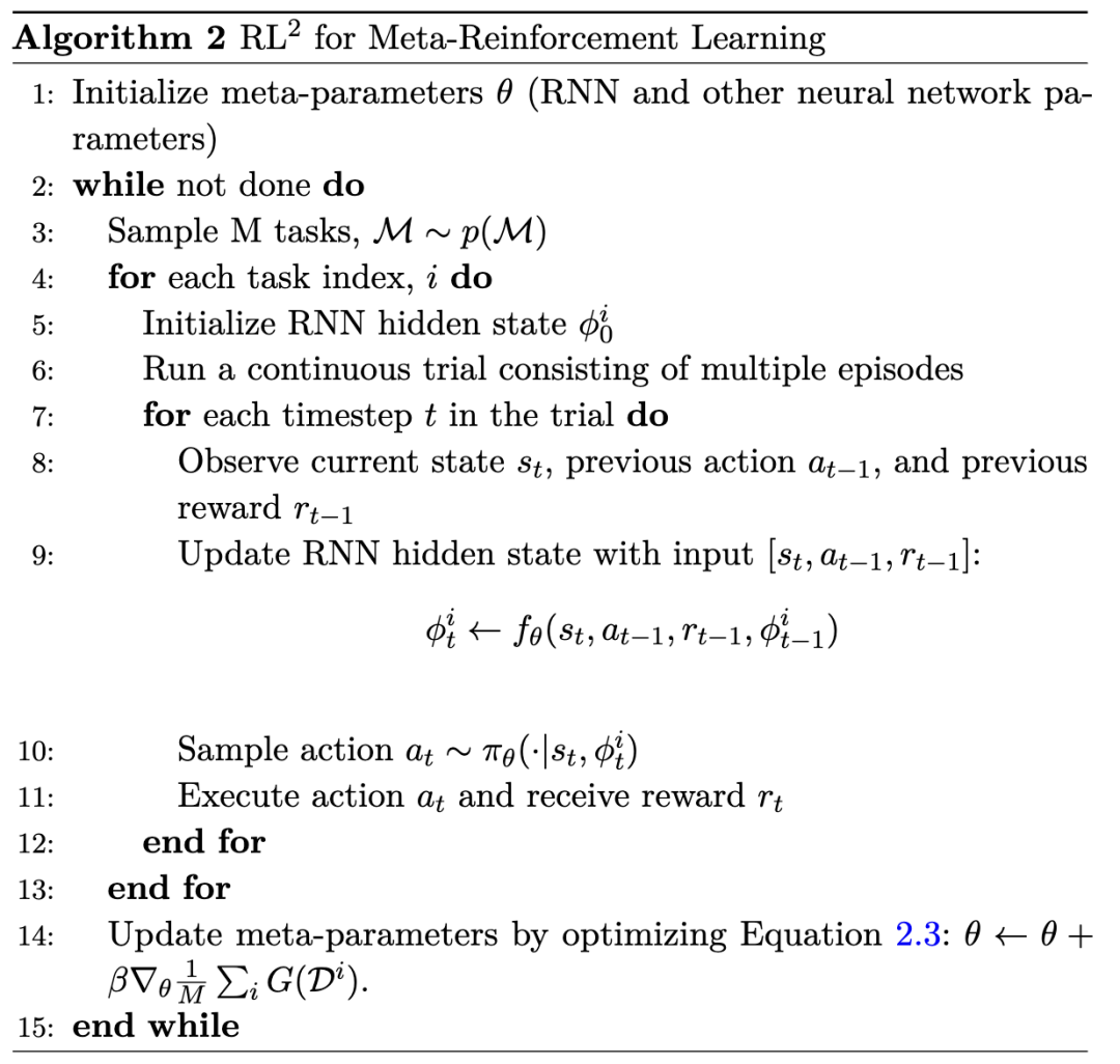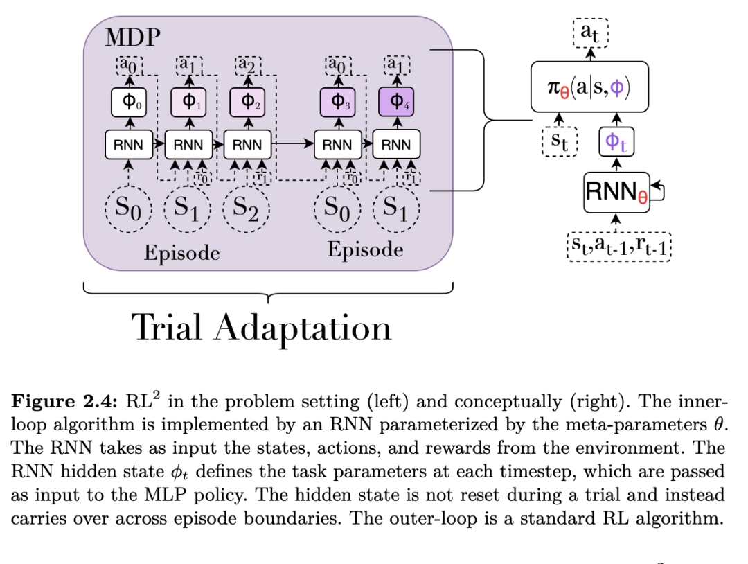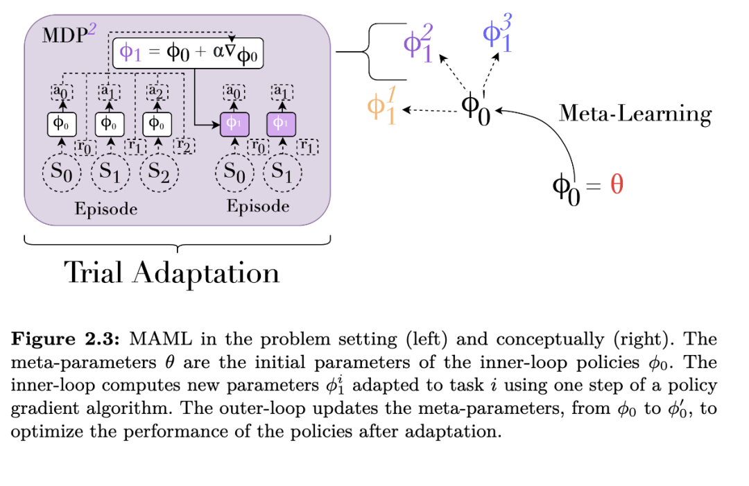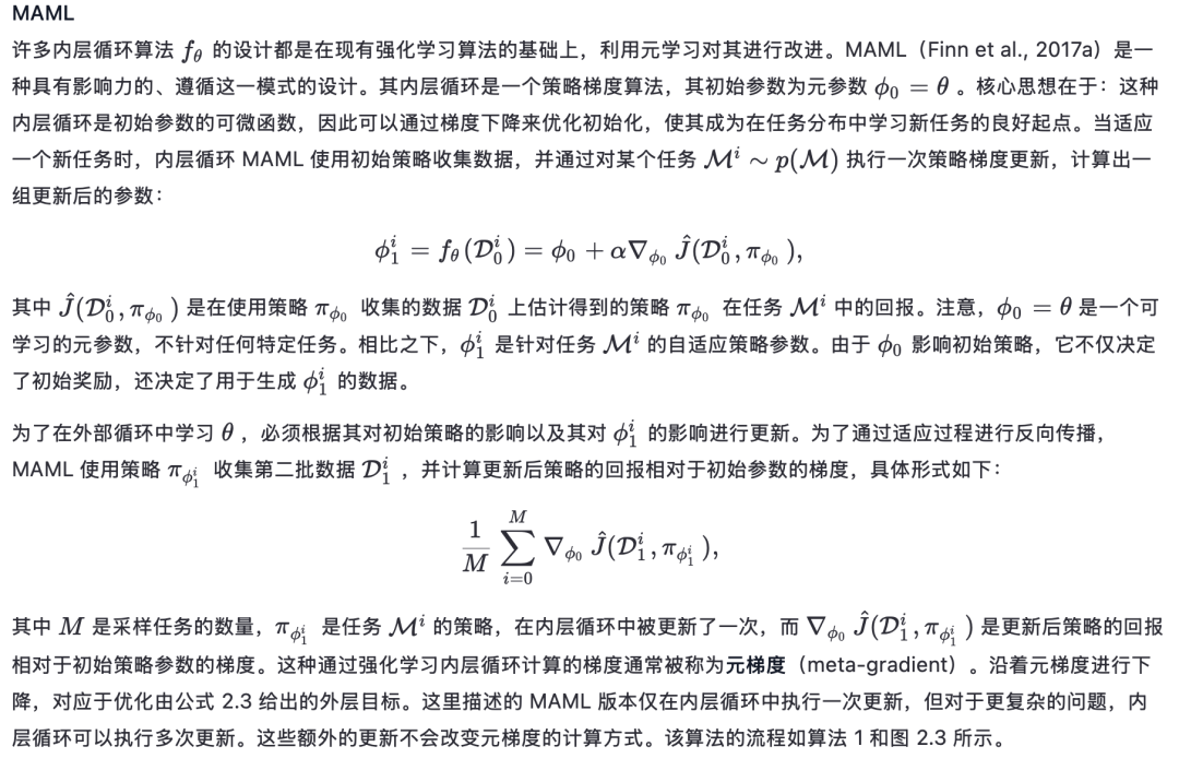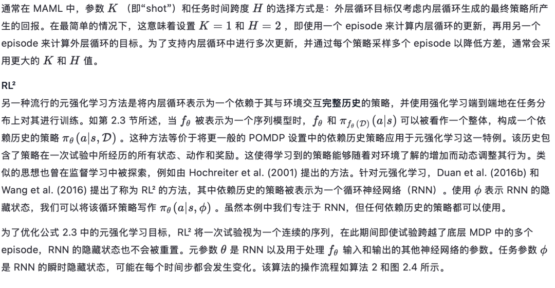 我们现在介绍两种经典的元强化学习(meta-RL)算法,它们优化由公式 2.3 给出的目标:模型无关的元学习(Model-Agnostic Meta-Learning, MAML),该方法使用元梯度(Finn et al., 2017a);以及通过慢速强化学习实现快速强化学习(Fast RL via Slow RL, RL²),该方法采用依赖历史的策略(Duan et al., 2016b; Wang et al., 2016)。许多元强化学习算法都基于与 MAML 和 RL² 类似的概念和技术,因此它们是进入元强化学习领域的极佳切入点。