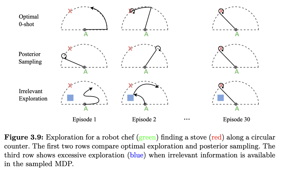 然而,后验采样也存在一个缺点。首先,由于所采用的策略始终条件于一个采样的任务,因此在这种方法中所有的探索行为都是由一个假设自己已知当前任务的策略执行的。这意味着同一个策略同时用于探索和利用。这可能导致在公式 2.3 的意义上产生次优的探索行为。考虑一个机器人厨师需要在弯曲的厨房台面上找到炉灶的情形。最优的探索方式是,厨师沿着台面边缘行走,直到找到炉灶。如果厨师必须在每个回合结束时重置到初始位置(例如,为了在回合末充电),那么机器人会从上次停止的位置继续探索。相比之下,使用后验采样的厨师在每个回合中只是走到台面上尚未检查的一个不同点,重复这一过程,直到找到炉灶。