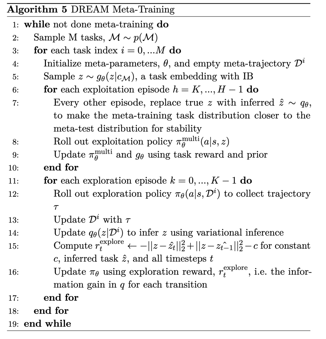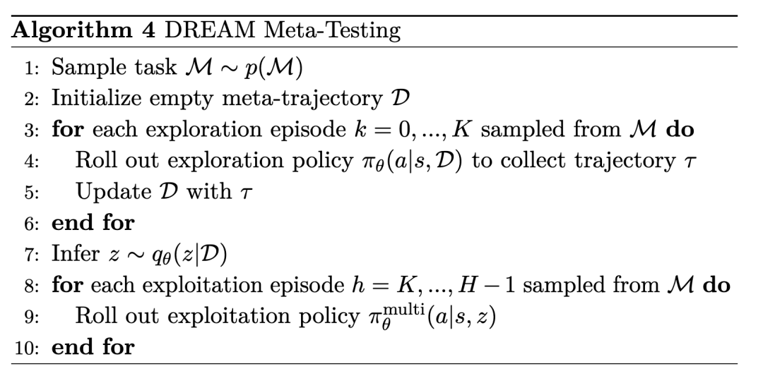 虽然从理论上讲,探索策略和利用策略可以完全按顺序进行元训练,但在实践中,为了训练稳定性,二者通常同时训练(Liu 等,2021;Fu 等,2021)。DREAM 的元测试和元训练过程分别在算法 4 和算法 5 中描述。然而,DREAM 仍存在一些缺点。例如,DREAM 需要以已知任务表示形式提供的特权信息,并且当在给定的 K 个回合内无法充分探索时(例如在零样本设置下),DREAM 可能表现次优。