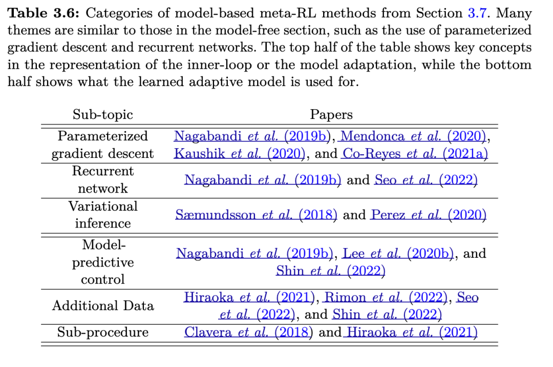 已有多种不同类型的基于模型的元强化学习被研究。为调整模型参数,部分基于模型的元强化学习论文采用类似MAML的梯度下降方法(Mendonca 等,2020;Kaushik 等,2020;Co-Reyes 等,2021a;Nagabandi 等,2019b),部分则采用类似RL²的黑箱循环神经网络(RNN)方法(Nagabandi 等,2019b)。另一种方法是对固定数量的历史状态转移进行编码(Lee 等,2020b),或使用变分推断(Sæmundsson 等,2018;Perez 等,2020)。基于模型的元强化学习中也出现了与无模型方法相似的主题,例如超网络的使用(Xian 等,2021)和状态转移的排列不变性(Galashov 等,2019;Wang 和 Van Hoof,2022),相关内容已在第3.2节和第3.3节中讨论。