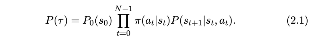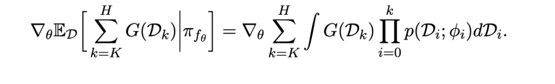 此处,我们考虑到先前轨迹的回报不受未来轨迹策略的影响。因此,我们将轨迹概率的乘积范围限制为仅从 i=0到 k。由于轨迹的概率依赖于 θ,我们使用对数导数技巧(log-derivative trick)来计算该乘积的梯度: