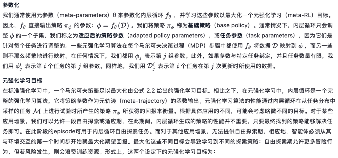 传统的强化学习(RL)算法是由人类设计、工程化和测试的。元强化学习(meta-RL)的想法是使用机器学习来学习算法 f 的(部分)内容。RL学习一个策略,而元强化学习学习输出策略的RL算法 f。这并没有完全消除过程中的人类努力,而是将其从直接设计和实现RL算法转变为以数据驱动的方式开发训练环境和参数化,以学习它们的一部分。