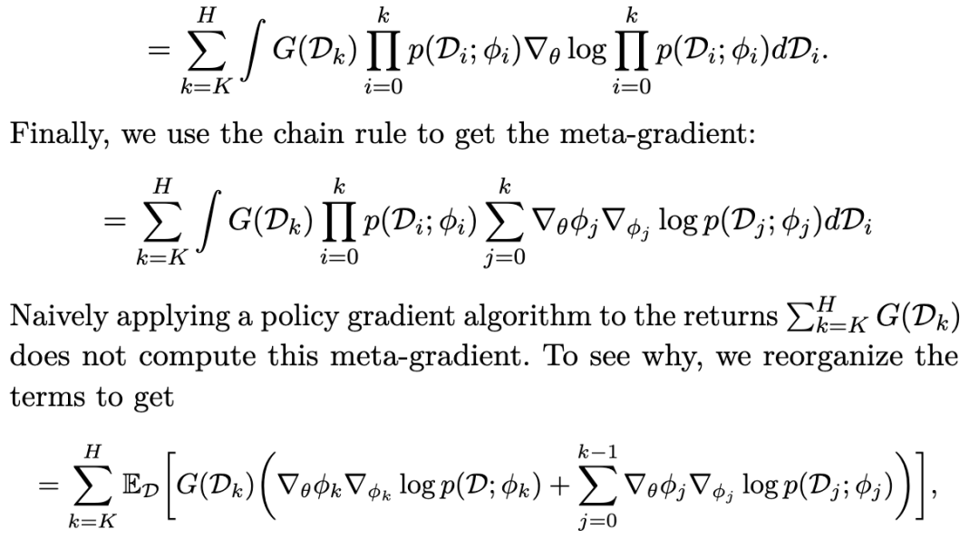 其中,第一个梯度项是针对第 k条轨迹相对于元参数的常规策略梯度,而求和中的梯度项则是针对第 j条轨迹(0≤j≤k−1)上策略相对于元参数的梯度。这些后一项有时被称为“采样修正项”(sampling-correction terms),在实践中常被忽略,从而导致有偏的元梯度估计(Al-Shedivat et al., 2018a;Stadie et al., 2018)。