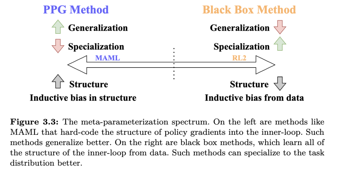然而,黑箱方法也存在权衡。虽然它们能紧密拟合任务分布 p(M)上的数据假设,从而增强专业化能力,但它们往往难以在 p(M)之外泛化(Wang et al., 2016;Finn and Levine, 2018;Fortunato et al., 2019;Xiong et al., 2021)。以机器人厨师为例:虽然它可能学会不接触热表面,但如果在元训练期间从未见过炉灶,一个黑箱机器人厨师不太可能学会如何使用炉灶这一全新的技能。相比之下,PPG方法在元测试阶段只要有足够数据,仍可能学会此类技能。尽管已有研究尝试通过扩展元训练任务集并手动添加归纳偏置来提升黑箱方法的泛化能力(见第4节),但选择使用黑箱方法还是PPG方法,通常取决于所解决问题中所需的泛化与专业化的程度。