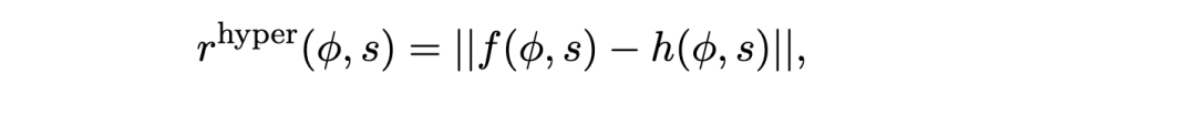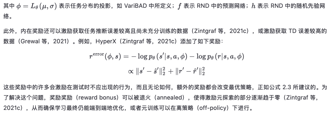 然而,有时仅添加任务推断奖励并不足够。在这种情况下,可以引入与标准强化学习中功能类似的内在奖励。例如,使用随机网络蒸馏(Random Network Distillation, RND)(Burda 等,2019),可以添加激励新颖性的奖励(Zintgraf 等,2021c)。在这种情况下,新颖性是在状态与任务表示的联合空间中衡量的,而不仅仅像标准强化学习那样仅在状态表示空间中衡量。例如,HyperX(Zintgraf 等,2021c)添加的奖励为: