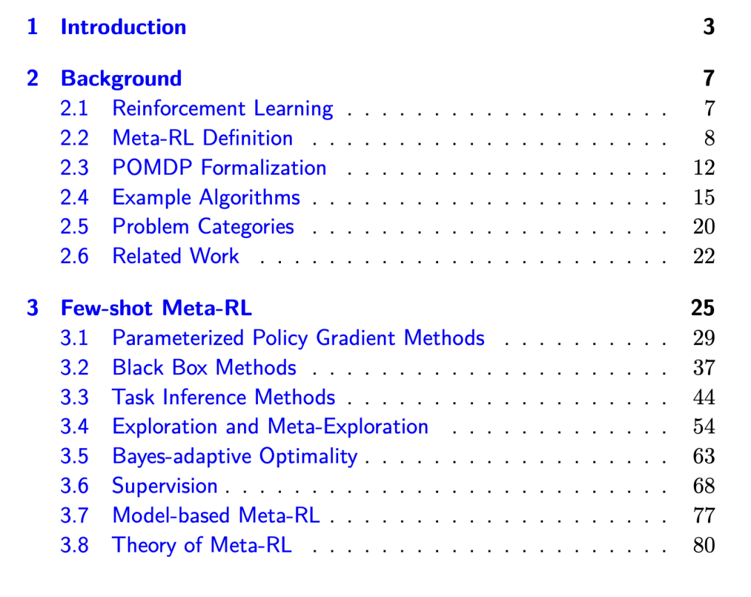 元强化学习的理论研究(Theory of Meta-RL) 最后,我们探讨元强化学习领域的理论研究。尽管元强化学习是一个相对较新的研究领域,但已有若干研究揭示了其中一些有趣的理论挑战。这些理论洞见与实证研究结果高度相关——而实证研究构成了当前元强化学习领域的主体。在第3.8节中,我们将综述元强化学习领域的重要理论工作。我们相信,元强化学习的理论研究仍有广阔探索空间,因此希望本综述能激发未来更多相关研究。