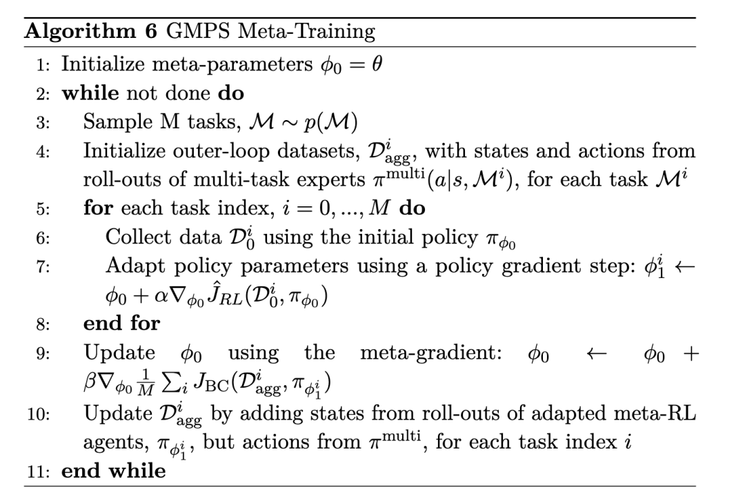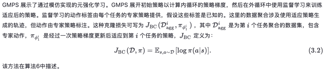 通过模仿实现的元强化学习 第三种设定假设在元训练阶段可以访问专家演示,这比标准奖励提供了更强的监督。例如,机器人厨师可能可以获得由人类厨师提供的带标签监督。这种设定可以提高样本效率并减轻在线数据收集的负担。该问题设定要求访问专家策略或专家数据。如果专家事先未知,可以按任务进行训练。或者,在多样本设定中,由现有强化学习算法优化的策略可以提供监督,这一过程称为算法蒸馏(algorithm distillation)(Laskin 等,2023;Kirsch 等,2023)。为了改进现有强化学习算法,学习速度可以通过对示范数据进行子采样而非学习完整的专家数据轨迹来提升(Kirsch 等,2023)。一种方法,即引导元策略搜索(Guided Meta-Policy Search, GMPS,Mendonca 等,2019),提出在外循环中模仿任务专家。在这种情况下,外循环可以使用监督学习,而内循环仍然学习一个在元测试时基于奖励条件的强化学习算法。他们特别研究了使用专家标签来指导MAML风格算法最终策略的使用。如果专家不可用,同时训练特定任务的专家也可以导致稳定的元训练(Mendonca 等,2019)。