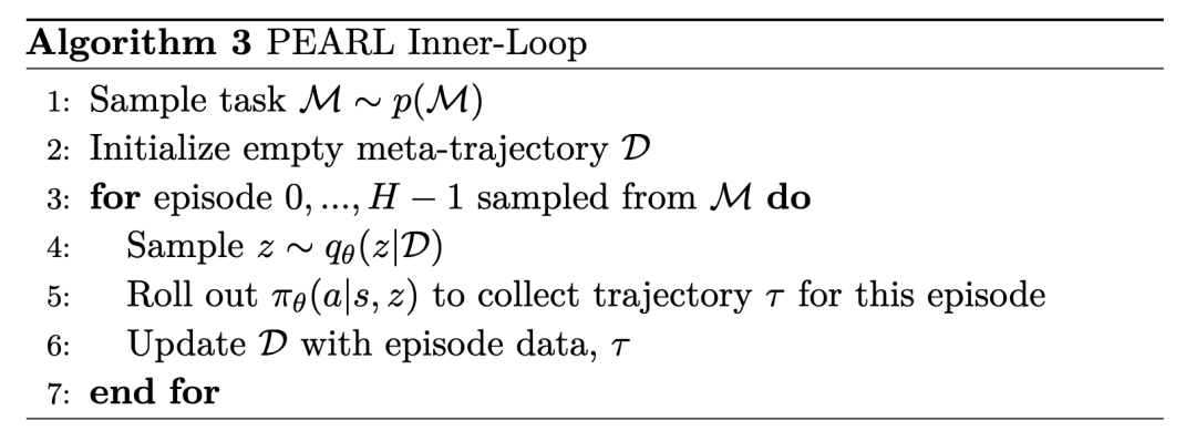 后验采样 为了克服隐式学习探索的挑战,Rakelly 等(2019)提出通过后验采样(posterior sampling)直接进行探索,这是 Thompson 采样(Thompson, 1933)在MDP上的扩展。该方法的内循环(PEARL)在算法 3 中描述。当智能体被置于一个新任务中时,基本思想是维护一个关于任务身份的概率分布,然后通过与任务交互不断迭代地细化该分布,直到它大致收敛为真实任务身份的点质量。后验采样通过在每个回合中从该分布中采样一个任务身份的估计值,并假设该估计值为当前回合的真实任务身份来进行行动,从而实现这一点。随后,该回合的观测结果用于通过黑箱方法(Rakelly 等,2019)或直接梯度下降(Gupta 等,2018b)更新该分布。