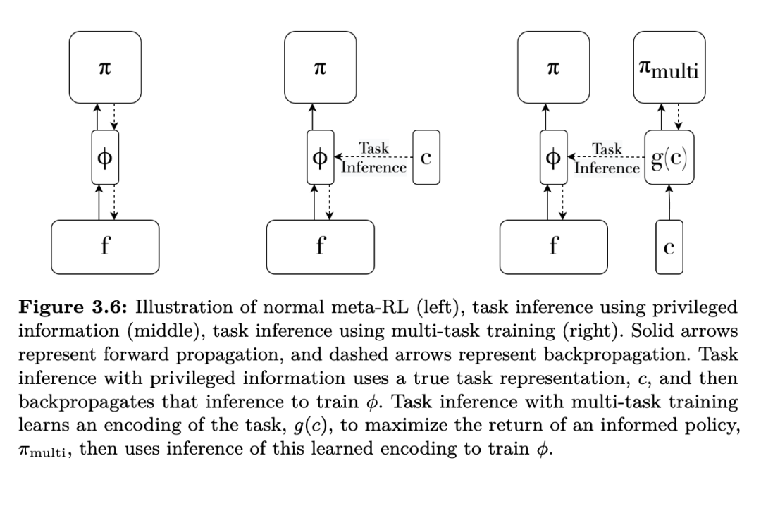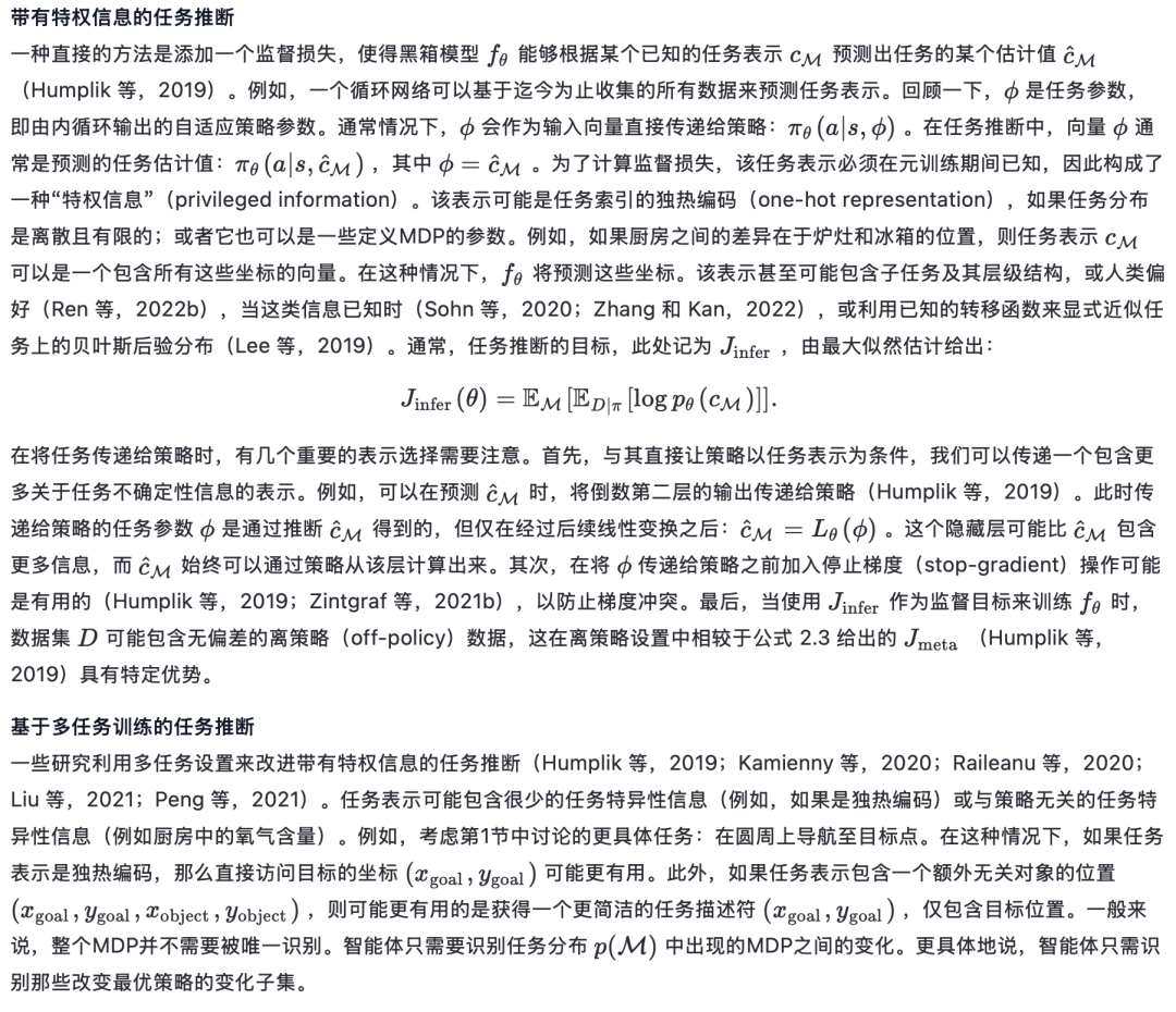当任务分布中仍存在不确定性时,任务推断方法通常不是将单一任务映射到基础策略,而是将当前数据所给出的任务分布映射到基础策略。这可被视为学习一个以(部分)推断任务为条件的策略。在此情况下,学习过程即为减少任务不确定性的过程。智能体必须收集有助于识别任务的数据——也就是说,智能体必须进行探索,以降低任务推断所给出的后验分布中的不确定性。因此,任务推断是构建探索策略的一种有效框架,许多任务推断方法也被视为探索工具,我们将在第3.4节讨论。最优地处理任务分布中的不确定性是困难的,相关内容将在第3.5节讨论。