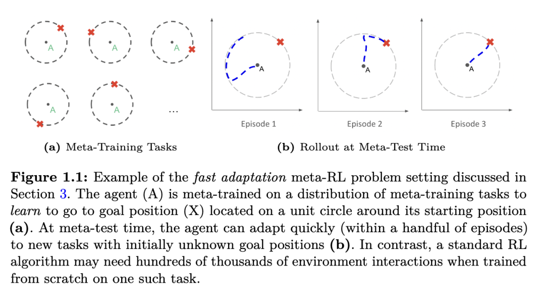 这些算法通常在给定的任务分布上进行训练,并通过元学习掌握如何高效适应该分布中的任意任务。图1.1展示了一个说明该设定的简化示例:一个智能体经过元训练,学会如何在二维平面上导航至不同的(初始未知的)目标位置。在元测试阶段,该智能体能够高效适应具有未知目标位置的新任务。