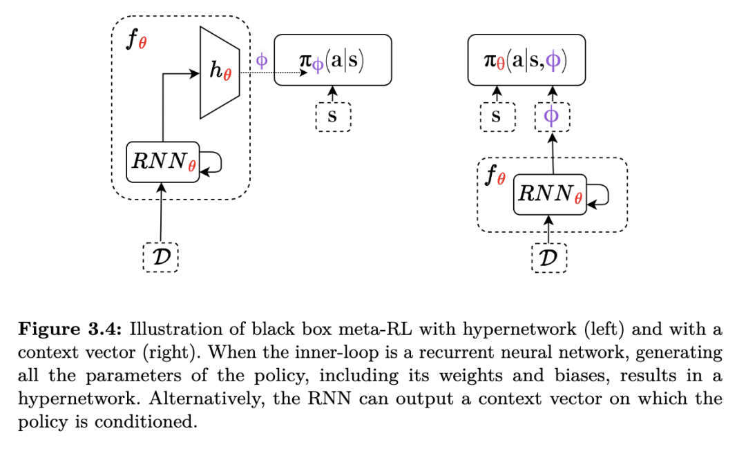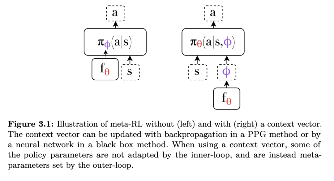 另外,一些 PPG 方法在内层循环中仅调整极少数量的参数。它们不调整所有策略参数,而是只调整一个子集(Zintgraf 等, 2019;Raghu 等, 2020)。例如,有一种方法仅调整策略网络最后一层的权重和偏置(Raghu 等, 2020),而其余参数在整个内层循环过程中保持不变。另一种方法仅调整一个称为“上下文向量”(context vector)的向量,策略的行为依赖于该向量(Zintgraf 等, 2019)。在这种情况下,策略本身的输入参数化了可能行为的范围。我们将策略写作 πθ(a∣s,ϕ),其中 ϕ是经过适应的上下文向量。策略的权重和偏置,以及初始上下文向量,构成了在内层循环中保持不变的元参数。我们在图 3.1 中展示了上下文向量的使用方式。