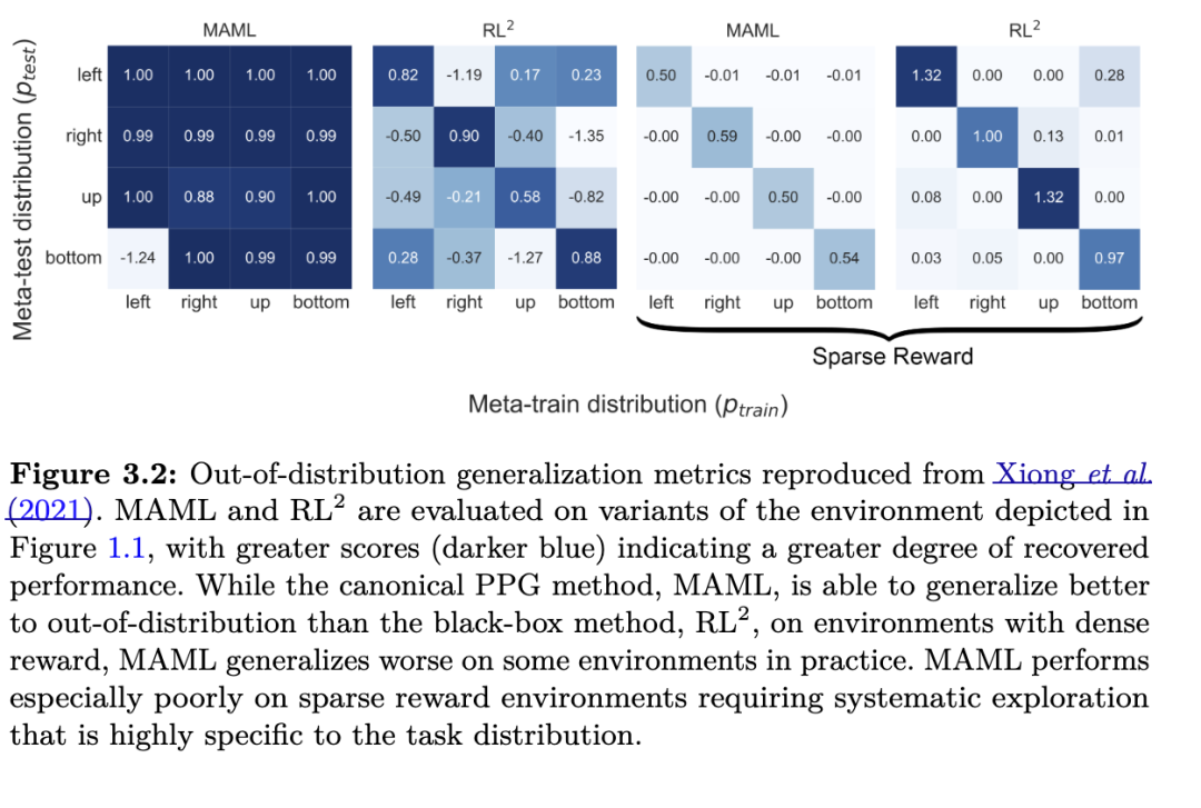 尽管将 fθ参数化为策略梯度方法可能确保适应过程具有泛化能力,但这种结构也带来了一种权衡。通常,内层循环的策略梯度具有高方差,并且需要覆盖完整episode的价值估计,因此梯度估计通常需要多个episode。因此,PPG方法通常不太适合那些要求在内层循环中每个时间步或极少数episode内实现稳定适应的小样本问题。这可能导致其性能相对于黑箱方法下降,例如图3.2所示的稀疏奖励环境,这类环境需要高度专业化和系统化的探索。此外,PPG方法在元训练阶段通常也样本效率低下,因为外层循环一般依赖于在线策略(on-policy)评估,而非能够高效复用数据的离线策略(off-policy)方法。