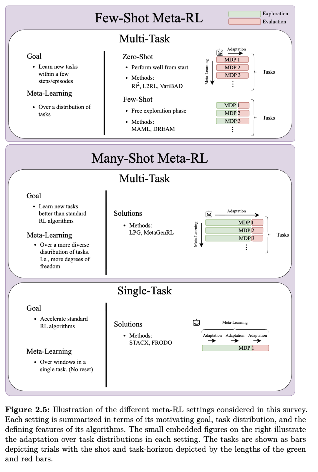 相关领域本综述的目标是介绍、总结并突出元强化学习(meta-RL)领域的研究成果。目前已有一些综述文献(Thrun 和 Pratt, 1998;Hospedales 等, 2020;Wang 等, 2020b;Parker-Holder 等, 2022;Kirk 等, 2023)涵盖了部分元强化学习方法,但它们在几个关键方面有所不同。Thrun 和 Pratt(1998)以及 Hospedales 等(2020)虽然都包含元强化学习方法,但更侧重于广义的元学习,包括元监督学习(meta-supervised learning)。Wang 等(2020b)综述的是小样本学习(few-shot learning)方法,但元强化学习的范畴比小样本学习更广,因为元强化学习不仅包含多样本问题,且在小样本设定下还需要依赖任务分布进行学习。Parker-Holder 等(2022)综述的是自动强化学习(AutoRL)方法,但也包含非学习型算法用于适应新MDP。Kirk 等(2023)综述的是强化学习中的泛化方法,其中包括元强化学习方法,但也涵盖非学习型算法以及无需适应的问题——即单一策略无需针对特定任务定制即可达到最优性能的问题。在所有相关机器学习领域中,元监督学习(meta-SL)和多任务强化学习(multi-task RL)与元强化学习关系最为密切。