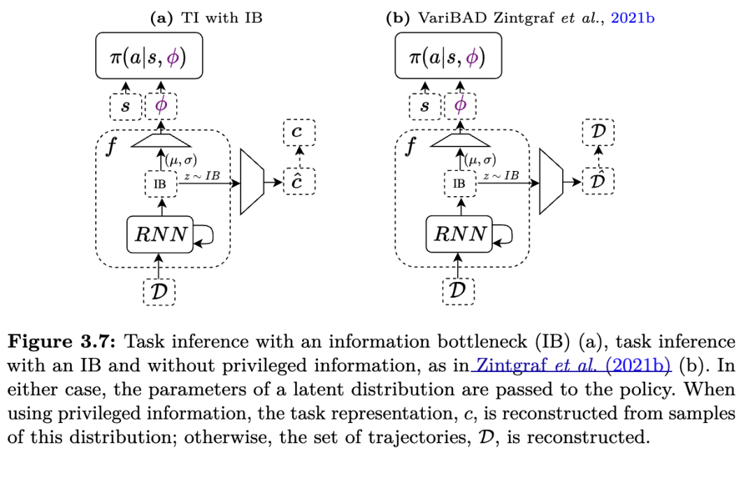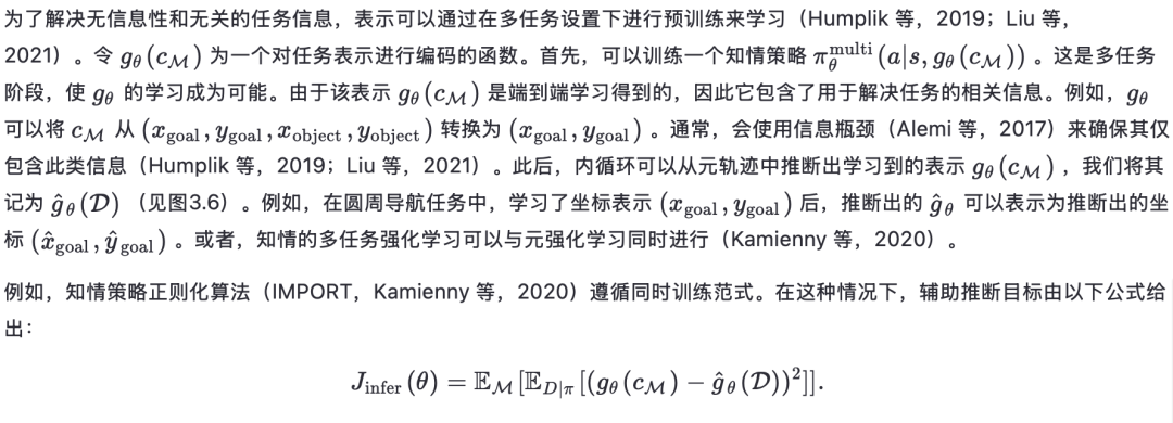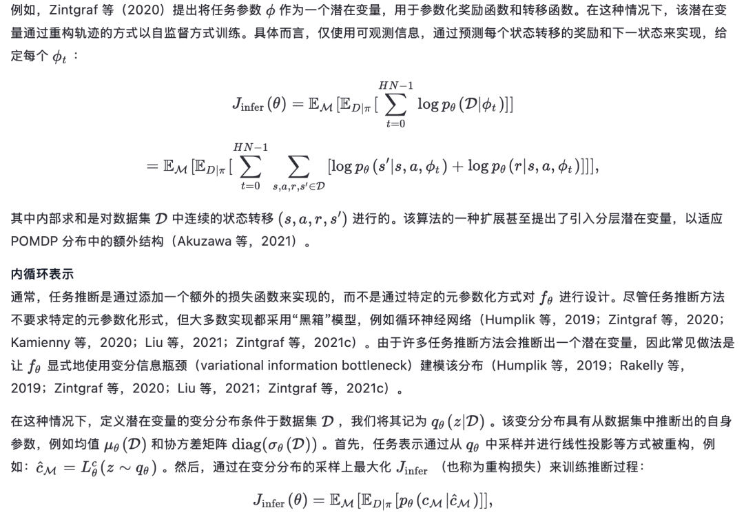 具体而言,这些内在奖励通常激励改进状态转移预测(即适应动态模型和奖励函数)(Zhou 等,2019),或激励在任务分布上获得信息增益(Fu 等,2021;Liu 等,2021;Zhang 等,2021)。其核心思想是:只要恢复出任务本身,就足以学习最优策略,从而在后续回合中获得高回报。尽管任务推断奖励可能会激励超出必要程度的探索——正如我们在本节关于“元探索”的讨论中所指出的——但这些奖励可以通过退火(annealing)逐步衰减,从而使策略最终仍可通过端到端方式进行优化(Zintgraf 等,2021c)。