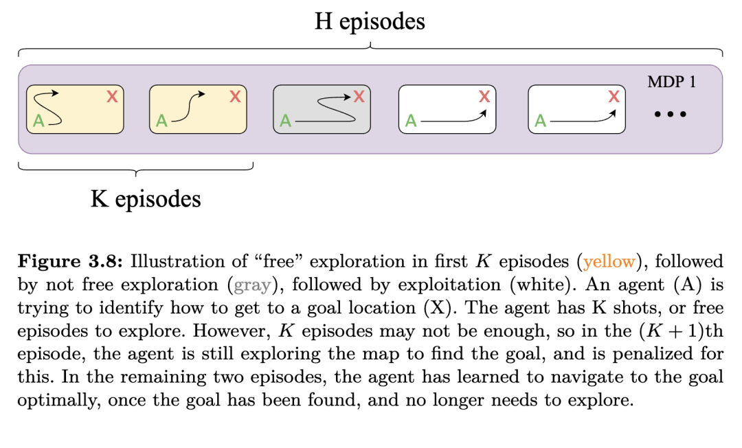 回想一下,在少样本适应(few-shot adaptation)设置中,每次试验时,智能体被放置到一个新任务中,并允许与该任务交互若干个回合(即其“少样本”数量 K),然后在接下来的几个回合中(即公式 2.3 中的 H−K个回合)对其解决任务的能力进行评估。图 3.8 展示了这一过程的示意图。直观上,智能体必须在最初的几个回合中进行探索以收集信息,从而能够在后续回合中最好地解决任务。更一般地说,这里存在一个探索-利用权衡(exploration-exploitation trade-off):智能体必须在采取探索性动作以学习新任务(可能甚至超出初始的少数几个回合)和利用已有知识以获得高奖励之间取得平衡。在前 K个回合中,由于没有给智能体提供任何奖励,因此总是最优的策略是进行探索。然而,在剩余的 H−K个回合中,最优的探索程度取决于评估阶段 H−K的长度:当 H−K较大时,更多的探索是最优的,因为牺牲短期奖励以学习更好的策略从而获得更高的长期回报是值得的;而当 H−K较小时,智能体必须更多地利用已有知识,以便在时间耗尽之前尽可能多地获得奖励。在本节中,我们将综述一些应对这种权衡的方法。表 3.4 总结了这些类别。正如第 2 节所讨论的,该探索问题存在一个最优解,它能最大化元强化学习目标。在下一节中,我们将讨论一个形式化地最优实现这种权衡的框架。