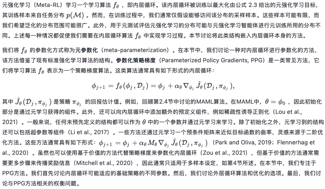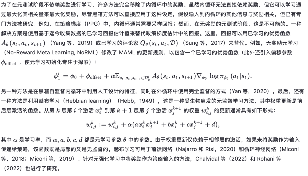 另一种方法是,一些 PPG 方法并不需要高阶元梯度。例如,Finn et al. (2017a) 使用元梯度的一阶近似,而 Song et al. (2020a) 使用无梯度优化(参见 Nichol et al., 2018a 对监督元学习中提出的另一种一阶近似的介绍,最近也被应用于元强化学习,Ren et al., 2022a)。此外,当像 MAML 那样在有限任务数或内层循环中数据量有限的情况下进行元学习初始化时,甚至可能更倾向于在元训练期间完全不执行任何内层步骤,即不针对每个任务进行适应(Gao and Sener, 2020)。在这种情况下,任务适应仅通过测试时的微调实现。缺乏显式的元学习可被视为该方法的一个局限性,并将在第6节中进一步讨论。此外,也可以在外层循环中使用基于价值的算法,而不是策略梯度算法,从而完全避免元梯度问题(Sung et al., 2017)。