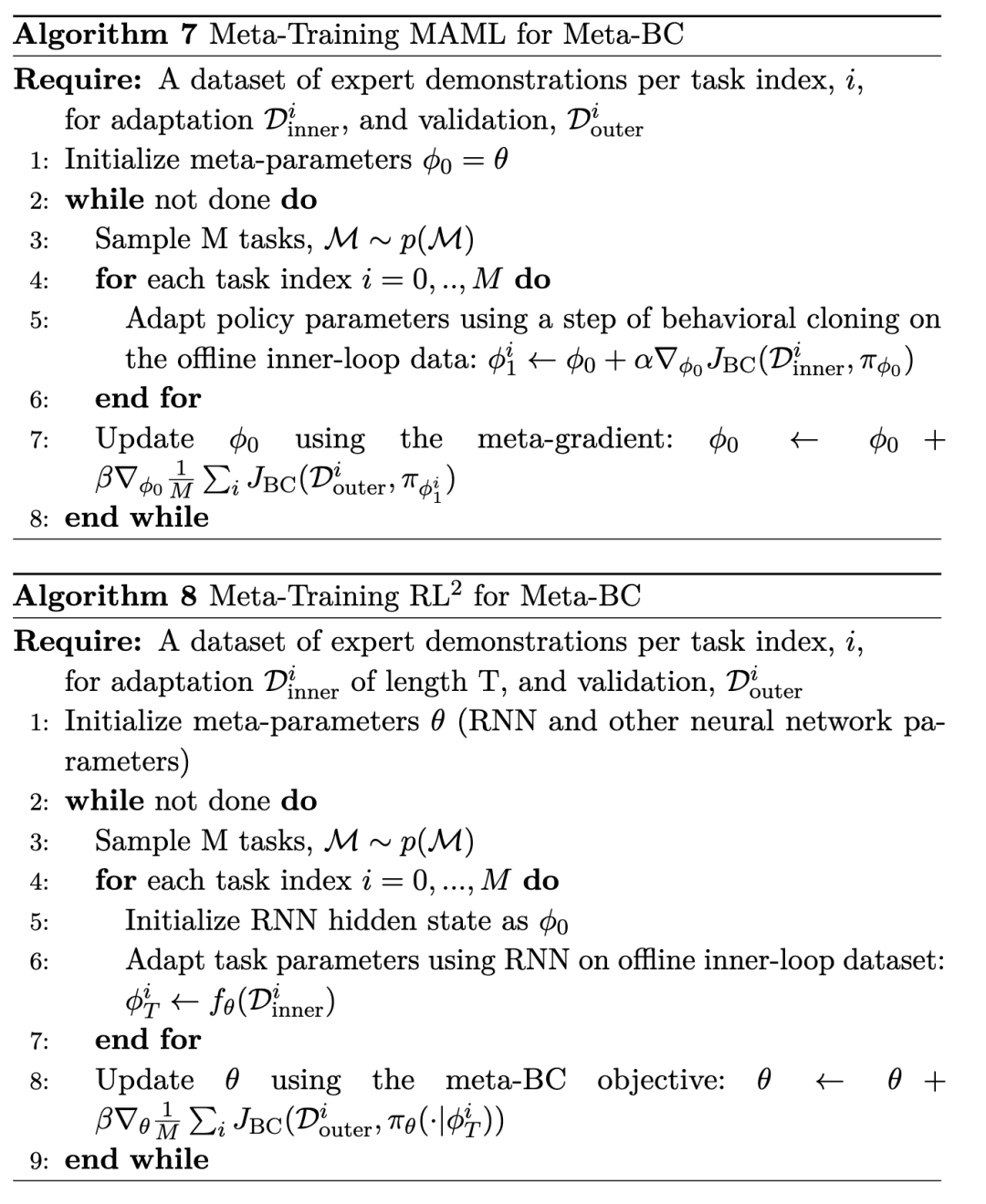 元强化学习研究与元模仿学习研究之间存在诸多相似之处。在元模仿学习中,同样存在黑箱方法(Duan 等,2017;James 等,2018;Dasari 和 Gupta,2020;Bonardi 等,2020)、PPG 方法(Finn 等,2017b;Yu 等,2018)和任务推断方法(Jang 等,2021),以及仿真到现实(sim-to-real)方法(James 等,2018;Bonardi 等,2020)。例如,要将 MAML 适配到元行为克隆,内循环和外循环均使用离线数据上的行为克隆损失进行计算,而非使用策略梯度。一种类似 Finn 等(2017b)的 MAML 适配于元行为克隆的算法如算法 7 所示。同样,要将 RL² 适配到元行为克隆,RNN 对离线数据集进行摘要,而非在线数据,而外循环使用行为克隆。一种 RL² 适配于元行为克隆的算法如算法 8 所示。