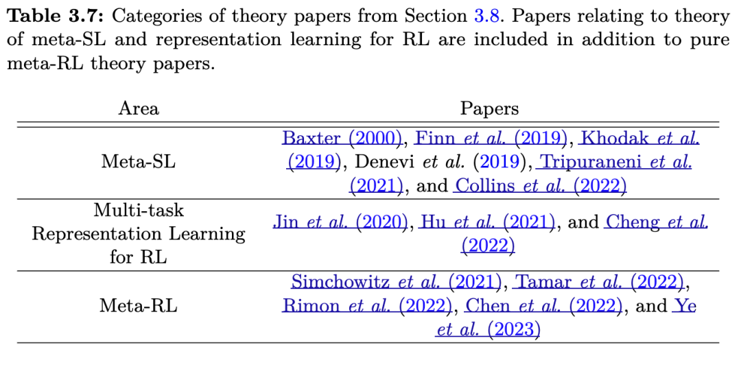 元强化学习理论旨在理解和形式化支配强化学习算法学习过程的基本原理。由于元强化学习是一个相对较新的领域,其理论探索深受相关领域——如元监督学习(meta-SL)和面向强化学习的多任务表示学习——的启发。然而,元强化学习带来了额外的挑战,因为其内循环需要学习一个强化学习算法。为了从理论上理解这些挑战,许多研究者采用了贝叶斯框架。本节整合了元监督学习与表示学习理论中的核心洞见,并概述了元强化学习领域内特有的理论进展。本节所讨论的论文总结见表3.7。