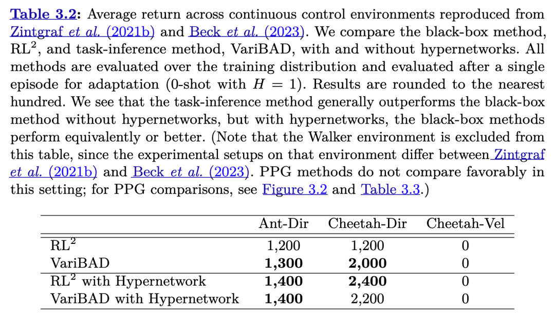 表3.2. 除了与PPG方法和黑箱方法的比较之外,任务推断方法还提供一些额外的优势。那些对奖励函数和动态模型进行建模的任务推断方法可用于采样额外的(想象出的)任务(Rimon 等,2022),这可被视为一种基于模型的元强化学习,相关内容将在第3.7节中讨论。此外,正如我们在第3.4节中所示,任务推断方法在探索方面也非常有用。