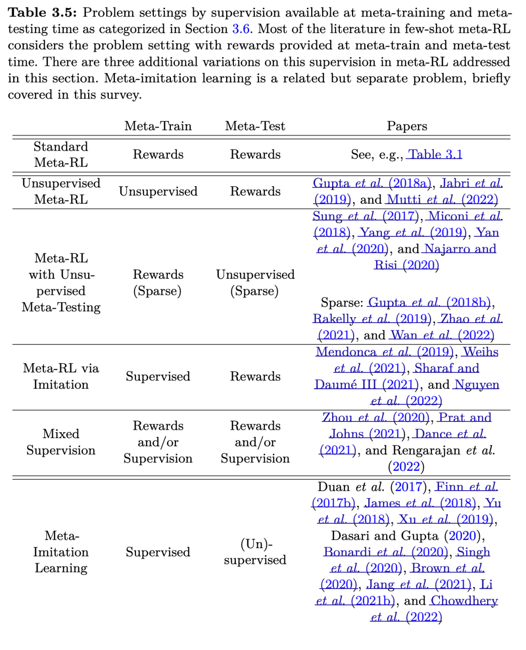 在本节中,我们将讨论元强化学习(meta-RL)中所考虑的大多数不同类型的监督形式。在迄今为止讨论的标准设置中,元强化学习智能体在元训练的内循环和外循环中,以及在元测试中,均接收奖励监督。然而,情况并非总是如此。研究者已考虑了多种变体,从无监督情况(即在元训练或测试期间完全无奖励信息),到更强形式的监督(例如,在元训练和/或测试期间可访问专家轨迹或其他特权信息)。每种情况都构成一个不同的问题设定,具有独特的方法,如表3.5所示。下文我们将按监督程度从低到高的顺序讨论这些设定。