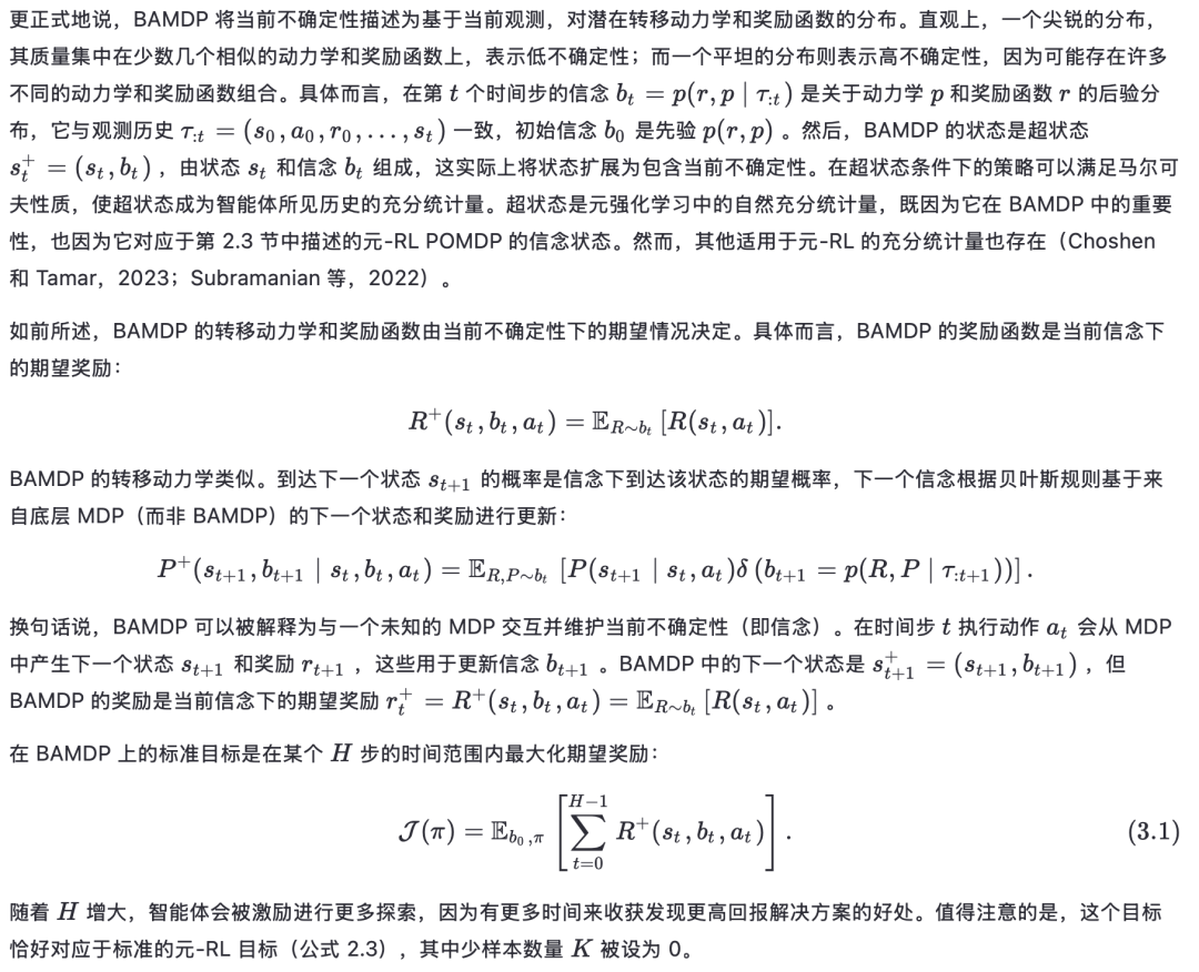 贝叶斯自适应马尔可夫决策过程 为了确定最优的探索策略,我们需要一个框架来量化当策略被置于一个动力学和奖励函数未知的 MDP 中时所能获得的预期回报。从高层次来看,贝叶斯自适应马尔可夫决策过程(BAMDP),即一种特殊的 MDP,正是为此建模的:在每个时间步,BAMDP 量化对 MDP 的当前不确定性,并基于不确定性下的期望情况返回下一个状态和奖励。然后,最大化 BAMDP 下回报的策略,就是在未知 MDP 中最大化回报的策略。关键在于,BAMDP 的动力学通过将当前不确定性扩展到状态中,满足马尔可夫性质。换句话说,最优的探索策略显式地基于当前不确定性来决定何时以及如何进行探索和利用。