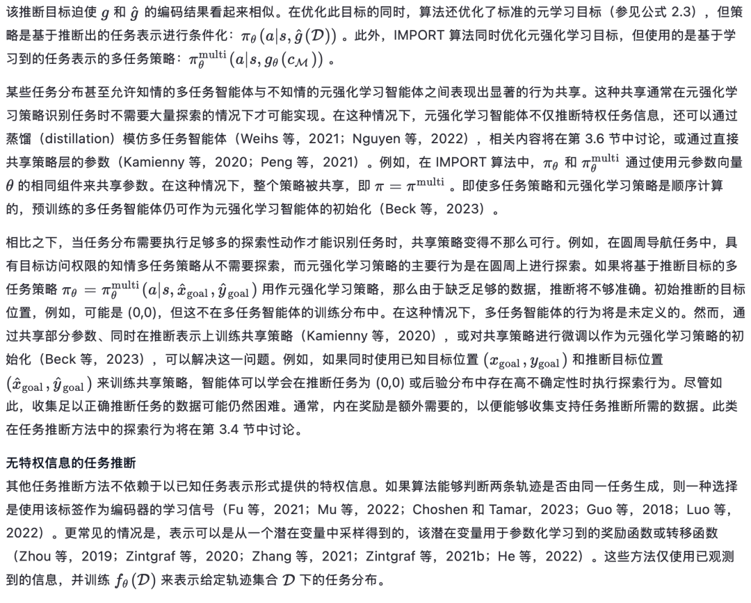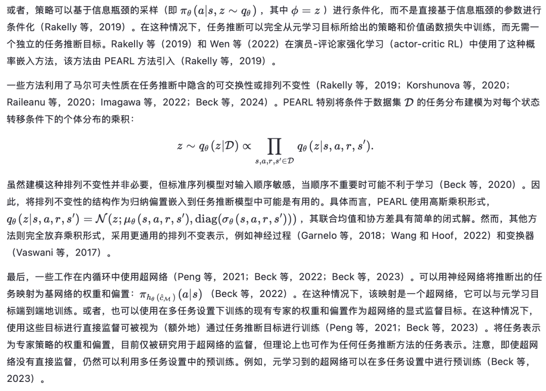 多任务强化学习多任务强化学习与元强化学习一样,也考虑MDP的分布。然而,元强化学习智能体必须自行识别所遇到的MDP,而在多任务强化学习中,智能体可以直接访问任务的真实表示(ground-truth representation)。虽然部分多任务强化学习的解决方案(如PopArt,Hessel 等, 2019)可直接应用于元强化学习(Grigsby 等, 2024),但评估方式的差异也使得某些方法无法直接迁移。例如,多任务强化学习通常在有限的离散任务集合上进行评估,而元强化学习智能体在测试阶段常常会遇到全新任务(Yu 等, 2020a;Teh 等, 2017)。这使得多任务方法可以为每个任务训练独立的网络(Teh 等, 2017),而此类方法在元强化学习中无法直接适用。