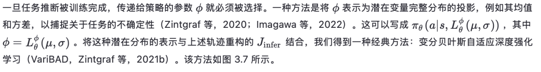 学习近似贝叶斯最优策略 直接计算贝叶斯最优策略需要在超状态上进行规划。由于超状态包含信念,即关于动力学和奖励函数的分布,这对除最简单问题外的所有问题来说通常都是不可行的。然而,存在实用的方法来学习近似贝叶斯最优策略(Lee 等,2019;Humplik 等,2019;Zintgraf 等,2020;Arumugam 和 Singh,2022)。核心思想是学习近似信念,并同时学习一个基于该信念的策略,以最大化 BAMDP 目标(公式 3.1)。