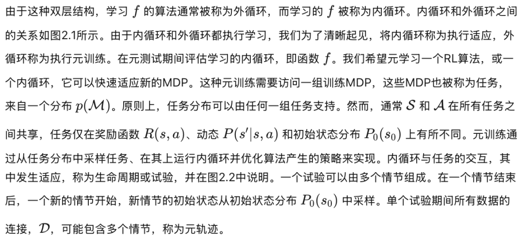 虽然小样本适应直接回应了元强化学习的核心动机问题,但有时智能体所面临的适应问题过于困难,以至于在少量episode内取得成功是不现实的。例如,当适应的任务不在训练任务分布的支持集内时,就可能出现这种情况。在这种情况下,内层循环可能需要数千个甚至更多episode才能为新任务生成一个良好的策略,但我们仍希望通过元学习使内层循环尽可能数据高效。我们将在第4节讨论这种“多样本多任务设定”(many-shot multi-task setting)。