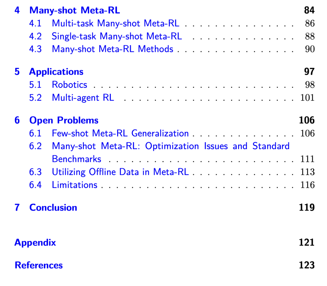 接下来,第5节介绍元强化学习的一些应用场景,例如机器人领域。作为综述的总结,我们在第6节讨论当前的开放性问题。这些问题包括:小样本元强化学习中如何泛化到更广泛的任务分布、多样本元强化学习中的优化挑战,以及如何降低元训练成本。