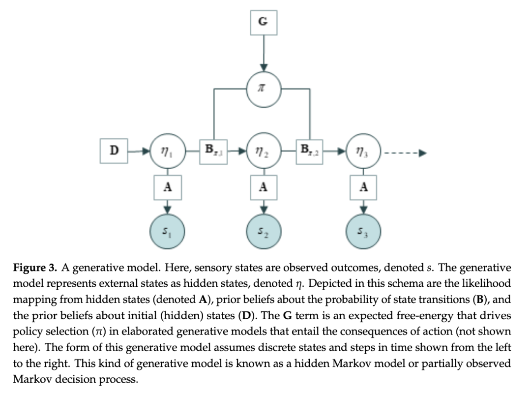 一个典型的生成模型如图3所示。在这里,隐藏状态(η)对应于位于马尔可夫毯之后、对内部状态不可见的外部状态。需要重点理解的是,关于隐藏状态的信念——即生物体所体现的假设——是关于其感觉输入之成因的解释。这些隐藏状态可以说具备了使其成为结构性表征内容的所有属性[8,31,32,34,35,56,93]。生成模型中的隐藏状态由系统的内部状态(例如大脑)参数化,并编码了关于外部状态的可利用信息,用以引导适应性行为。我们稍后将回到这一点。