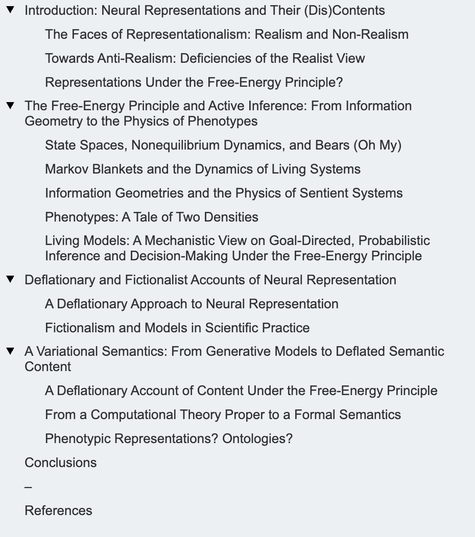 尽管本文旨在探讨非实在论认知进路的后果,我们注意到,我们所提出的实用主义解释可能与某些实在论的结构表征主义观点相容——在这些观点中,内容由功能同构决定,从而通过某种功能角色语义学阐明结构表征的作用[8,32,81]。这些观点明确朝着一个方向发展:其所表征的系统无需在现实中真实存在,这与我们刚刚提出的“本体论”观点是一致的。自由能原理支持这样一个主张:存在承载语义内容的表型状态;在此,我们为这种数学语义构建了一个完整的计算理论。最终,我们如何称呼这些状态,或许只是一个偏好问题。
