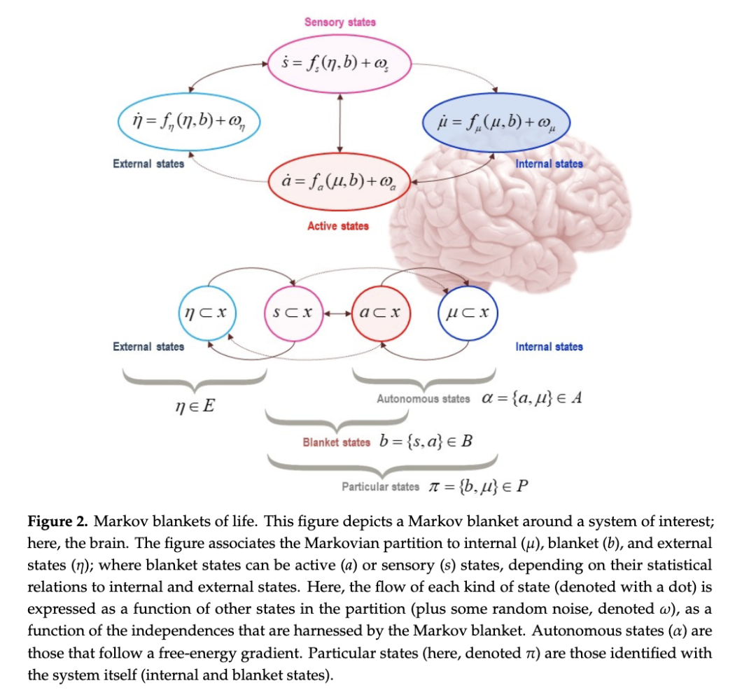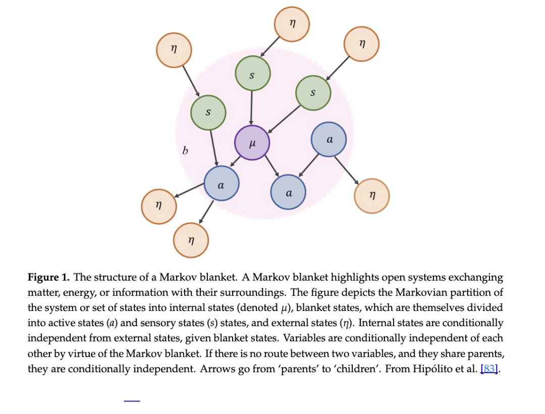 一个系统若要存在(独立于宇宙其余部分),必须具备一定程度上与其嵌入环境的独立性。马尔可夫毯是一组变量或状态,我们用它来约定性地界定一个系统:哪些属于其内部(内部状态,记为 μ),哪些不属于(外部状态,记为 η)。马尔可夫毯本身被定义为介导系统与其嵌入环境之间相互作用的状态(主动状态和感觉状态,分别记为 a 和 s)。马尔可夫毯由某些连接的缺失所定义:内部状态不会引起感觉状态,外部状态也不会引起主动状态。参见图1和图2。