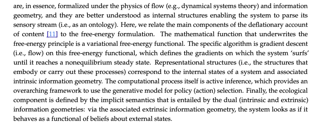 支撑自由能原理的形式体系允许我们做出一个关键观察:即当前所涉及的数学结构与过程,是在状态空间上定义的,并隐含地也在相关的信念空间或统计流形上定义[93]。状态空间形式体系的数学框架意味着,系统的动力学是在系统状态上定义的;而由于相应的外在信息几何,我们总能为这一内在描述赋予一种语义。