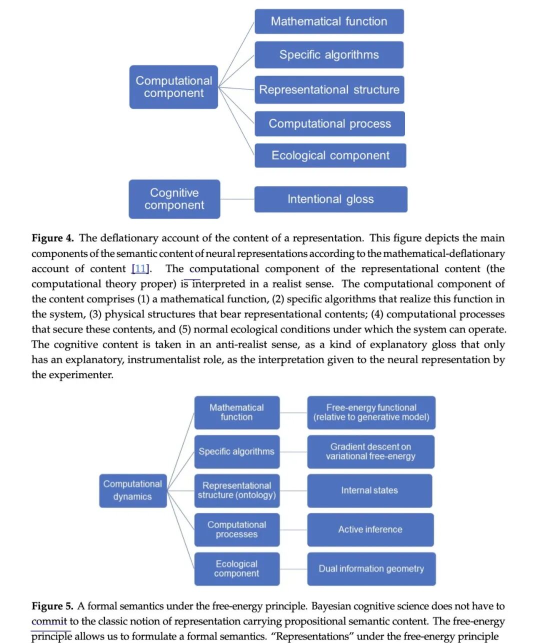 在此观点下,确定内容相对容易,因为计算模型中使用的数学函数可以独立于被研究系统的使用方式——即独立于所建模的过程——加以理解。这恰好回应了自然主义表征理论最常见的缺陷:即通过诉诸科学实践,预设了它们本应解释的内容。神经表征的数学内容在计算理论本身中被加以利用,该理论由五个要素组成([11],见图3):