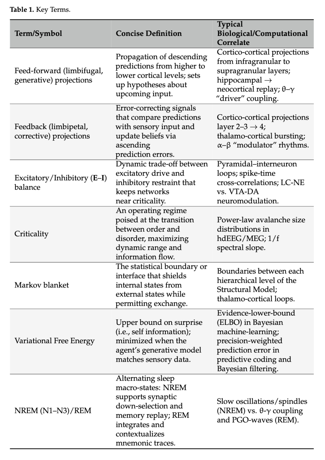 在回顾关键实证证据、重温变分推理及其伴随临界性的基本原理之后,我们将在结论部分探讨实验预测、现象学含义,以及我们识别为意识体验的神经兴奋与抑制特性。在下一节中,我们将总结关键术语。