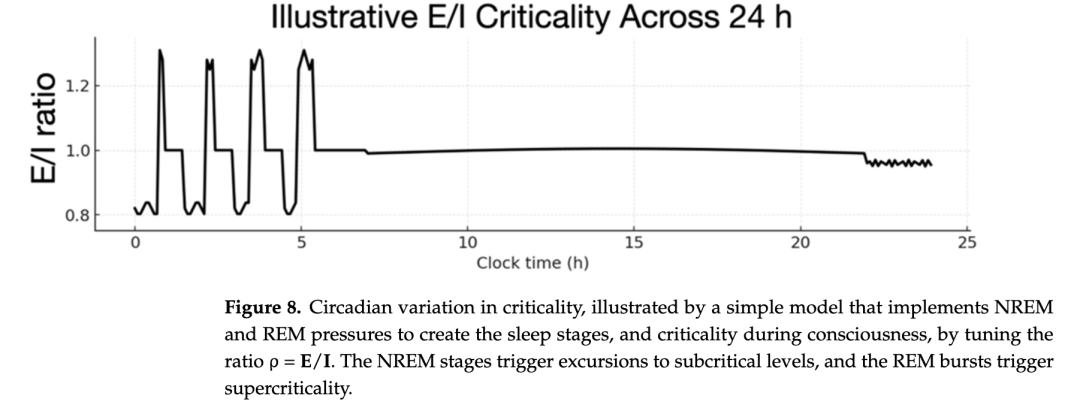 图8展示了E–I临界性在昼夜节律中的变化。REM睡眠压力(C过程)在24小时内受食欲素(orexin)与黑素浓集激素(MCH)耦合机制的调节。NREM睡眠压力随清醒期间腺苷的积累而增加,而NREM通过腹外侧视前区(VLPO)抑制唤醒控制系统。每次NREM发作时,系统显著下降至亚临界范围;而在每次REM发作期间,伴随多个PGO波放电,系统出现相位性的超临界偏移。