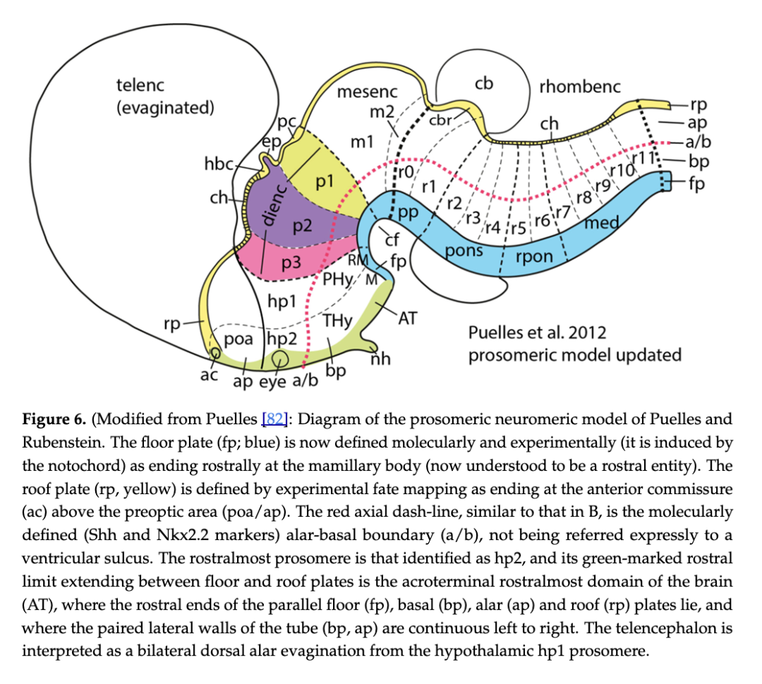 通过对艾伦研究所基因表达数据库的研究,人们对哺乳动物神经解剖学的进化-发育基础正获得新的洞见[82]。图6显示,神经管的主要分区——包括顶板、翼板、基板和底板——终止于下丘脑的顶端终末域(acroterminal domain)。整个端脑则起源于翼板,该区域负责神经管的内脏感觉领域,尤其源自hp1下丘脑域。这一近期(在进化时间尺度上)发生的基因指令突变——使脊椎动物端脑从翼板发育而来——具有何种意义?