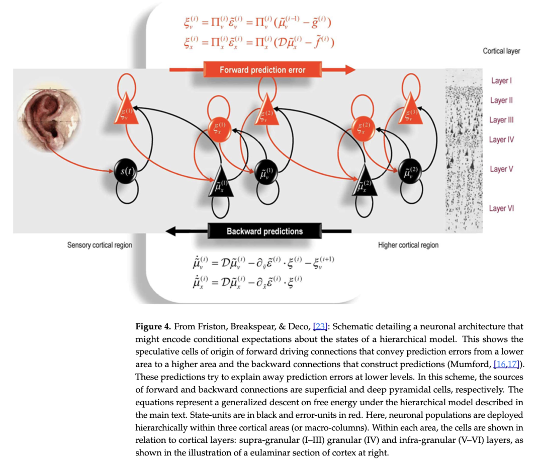 图4说明了在听觉感知中,主动推理如何在皮层层级中运作,组织从右侧较高级皮层区域(如异模态皮层)、经中部单模态联合皮层、到左侧初级听觉皮层的信息交流[23]。对“应听到内容”的前馈预期(黑色预测)从高级区域传递到低级区域(黑色状态单元和黑色箭头),而来自感觉数据的反馈校正(红色预测误差)则在低级区域被处理,以根据感觉误差更新预测。请注意,图4中的图示采用了神经科学传统假设,即“前向”信息流始于感觉输入;然而从控制理论角度[52]来看,这种感觉更新更宜被描述为反馈控制——本文始终采用这一用法。
