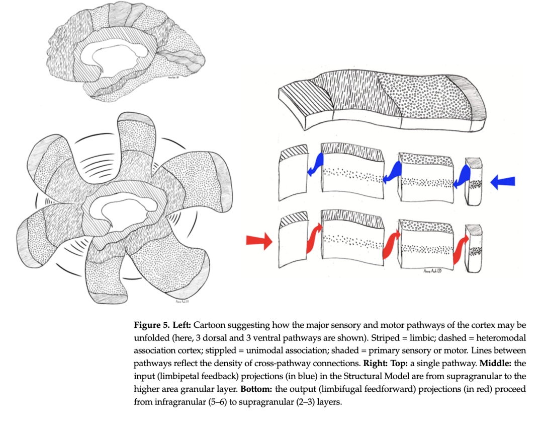 图5提供了一个示意图,说明边缘控制如何与贝叶斯信念更新相整合。左侧展开显示了人脑的若干感觉与运动通路,表明认知整合——通过相互连接的异模态皮层(虚线)——由边缘基础(条纹区域)适应性调节,该边缘基础代表皮层层级中更“高层”的区域。右侧显示了一条通路在层级结构中的预测加工过程,反映了结构模型中从颗粒下层向颗粒上层流动的从边缘向外(limbifugal)方向(红色),这对应塔克与卢[31,42]提出的兴奋性前馈控制。而从颗粒上层向第4层的平衡性反馈控制——介导误差校正[25]——以蓝色箭头表示,反映了感觉数据对知觉施加的约束,我们提出这一反馈过程受焦虑的抑制性动机控制所调节[31]。