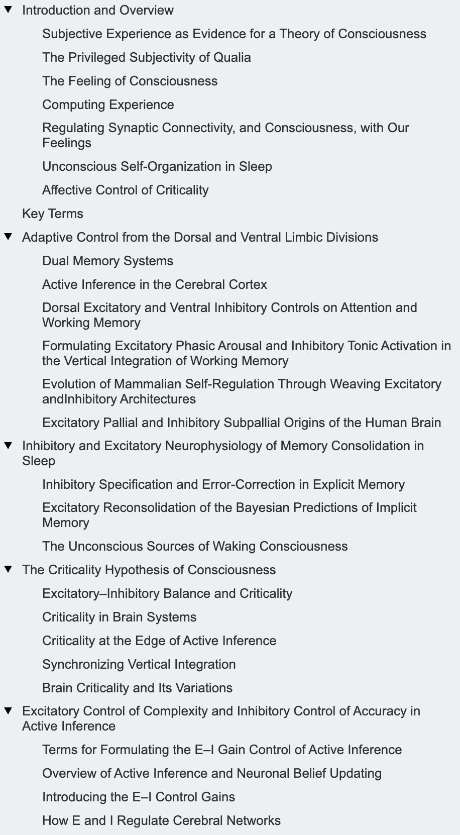 当 ρ 保持在其最优值附近、我们大致处于 E–I 平衡状态时,意识流会感觉生动而连贯。在白天积累睡眠负债的过程中,我们产生稳态动机,以便在夜间通过 NREM-REM 记忆巩固重新平衡记忆系统。随后,经过夜间周期逐步的自组织过程,醒来时的 E–I 平衡大致处于临界状态,因此我们醒来时也大致处于有意识的状态。临界性从而允许体验中秩序的增强。当焦虑(分化)与欣快(整合)两者达到平衡并实现层级整合时 [3,110],我们在主动推理的临界边缘实现概念结构与信息秩序的增强(↓ F)[23]。