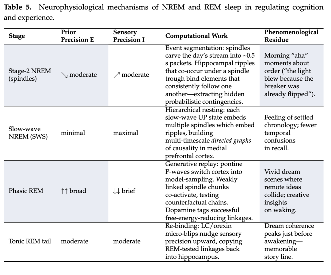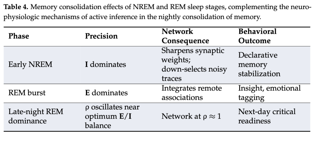记忆的巩固并非简单的记录过程,而是一个两阶段的组织过程:在NREM睡眠中,通过抑制性神经生理机制(海马尖波涟漪、纺锤波和慢波振荡),继而在REM睡眠中通过兴奋性神经生理机制(在缺乏感觉-运动约束条件下,全局胆碱能兴奋性演练预测性先验),依次组织认知能力与现象体验(见表5)。