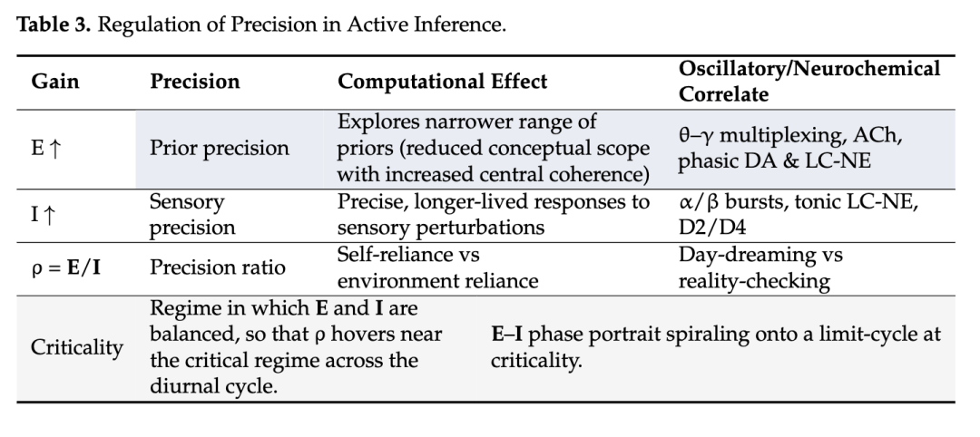 表 3 总结了增益控制中的 E 和 I 因子如何运作,以调节主动推理中先验信念与感觉误差校正的精度因子。