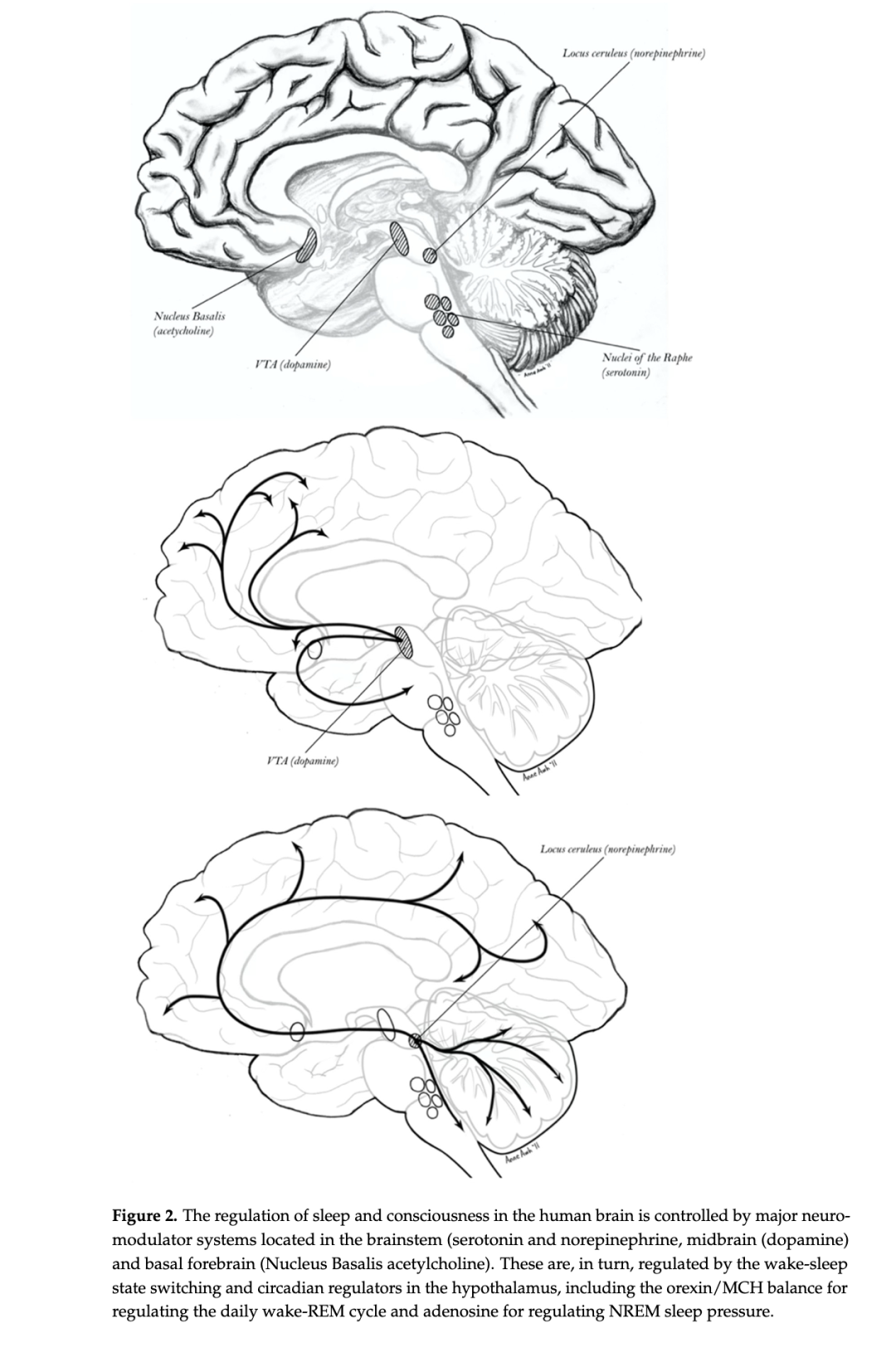 在睡眠与清醒状态下,大脑半球的神经活动与认知操作由特定神经调质的脑干和中脑唤醒控制系统(连同前脑基底核,见图2)所调控。这些系统又受到端脑层级结构——包括皮层、边缘系统、纹状体和丘脑系统——的复杂模式调控。