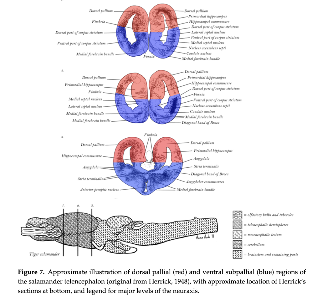 然而,端脑分化出了其感觉与运动能力。在四足动物(两栖类与爬行类)的初始组织中,兴奋性皮层区(锥体细胞、谷氨酸能)与抑制性皮层下区之间几乎完全分离[83]。之所以说“几乎完全”,是因为皮层区内仍存在一些抑制性中间神经元,而皮层下区内也存在兴奋性胆碱能细胞,其性质与皮层区内的中间神经元相似。